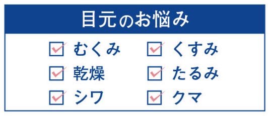第一印象で大切と言われる、表情や姿勢などの見た目。その中でも特に印象が強いのが“目元”です。目元は、見た目の第一印象の8割を占めるとも言われています。目元に対する悩みの種類はむくみ、クマ、シワ、たるみ等と多いものの、ケアをできていない人が多いことも特徴です。