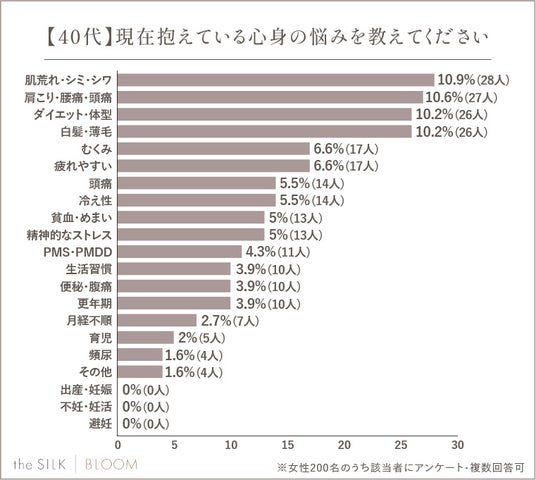 年を重ねるごとに新陳代謝が低下するため、年々増える肌や体型の悩みが大きな不安要素となっているようです。