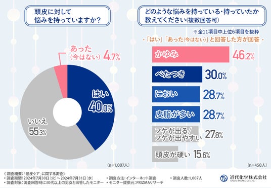 今回の調査結果で、30代以上の男女の半数近い方が頭皮の悩みを抱えた経験があることが判明しました。主に、かゆみやべたつき、においや皮脂の量といった悩みが多く、特に夏に頭皮の悩みを感じやすいようです。