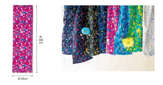 愛媛県今治市で約130年の歴史を持つ今治タオルに、増田セバスチャンのアトリエで生まれたカワイイカンパニーの8つのキービジュアルをプリントしました。綿タオルに美しくプリントをすることはむずかしいとされますが、それを実現するため研究を重ねて作り上げたタオル地は、一般的なタオルの1.5倍ほども糸を詰めて織り上げられています。縦約100cm、横約30cmのロングサイズなので、一枚で頭から足先まで全てカバーでき、しっかりしているのにやわらかく、肌に当てるとキュッと水を吸い取る気持ちよさです。