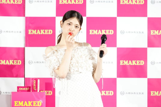イメージキャラクターである松村さんが、肩周りを程よく肌見せした”ズル可愛い”衣装で登壇しました。今回パッケージリニューアルに伴いイメージキャラクターに就任した感想について、「EMAKEDをずっと使わせていただいていたので、お話を頂いたとき驚きました!アイドル時代からまつげ命でケアしていて、まつげには自信があるので嬉しいです。」と、普段より愛用している商品のイメージキャラクターに起用されたことに対し、胸を弾ませながら笑顔でコメントしました。