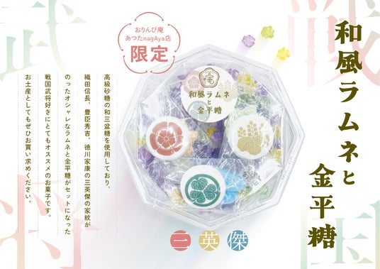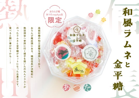 和三盆を使用したカリっとした食感とホロホロとしたくちどけが特徴の和風ラムネと金平糖におりんぴ庵のロゴや三英傑の家紋があしらわれたオリジナル商品を販売いたします。こちらの商品はおりんぴ庵 あつたnagAya店のみ販売の限定商品です。店舗を訪れた記念にぜひお買い求めください。