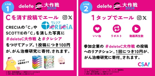 1.クレシアの商品やロゴに関連する「C」の部分を自由なカタチで消した画像や動画を、「#deleteC大作戦」と「#クレシア」や「#スコッティ」をつけて参加者がSNS【X、Instagram】で投稿すると1投稿あたり100円をdeleteCへ届けます。