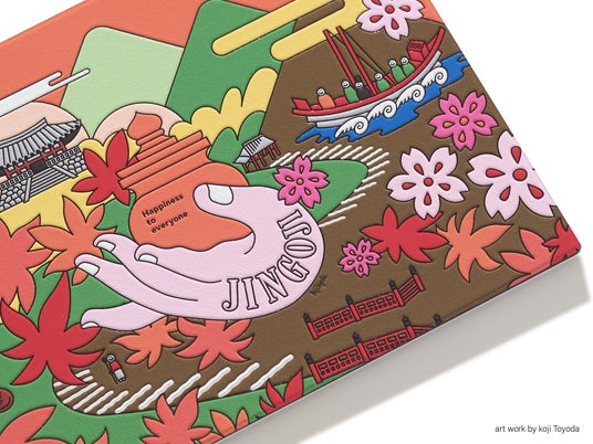 平安初期彫刻の最高傑作である国宝「薬師如来立像」の薬壺を持つ手元を中心に、紅葉や新緑の名所としても知られている、神護寺の自然豊かな環境がカラフルに表現されています。参道の入口にある高雄橋から長い石段を登り、境内最奥の地蔵院から眺めることができる錦雲渓の絶景までの参拝ルートの様子や、厄除けの「かわらけ投げ」を楽しむ人の様子もポップに描かれており、よくよく見ると806年に唐から日本に帰国した空海の姿も見つけられます。神護寺の名所や歴史の魅力をたっぷり詰め込んだ立体ポストカードです。