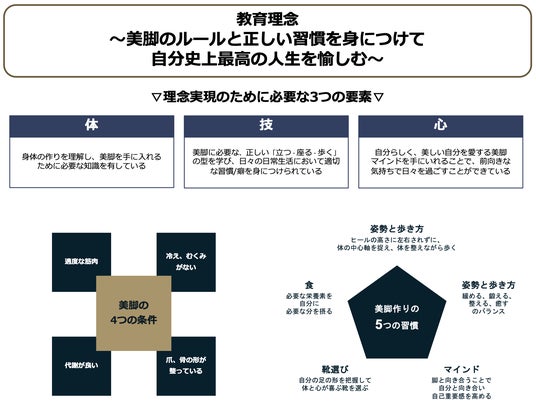 本アカデミーは「美脚のルールと正しい習慣を身につけて、自分史上最高の人生を愉しむ」を理念として定めており、「体」「技」「心」を上記の理念実現のために必要な3つの要素として掲げ、独自の視点から美脚作りの基準を設けてアプローチするカリキュラムをご用意しています。