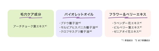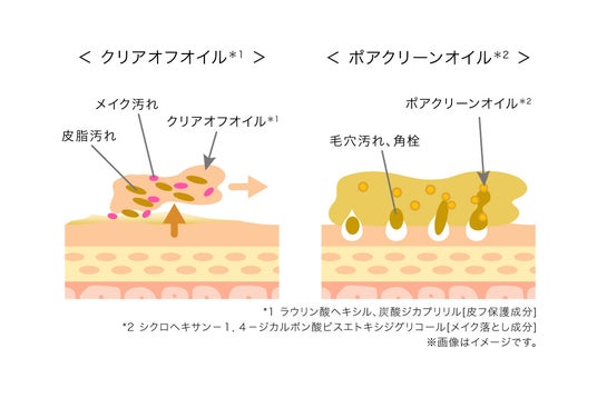 “肌表面の汚れ”を浮かせて落とす「クリアオフオイル*2」と、“毛穴にたまった汚れ”を溶かして落とす「ポアクリーンオイル*3」のダブル配合。毛穴汚れや古い角質、角栓をすっきりオフして、つるんとした毛穴レス*1肌へ導きます。