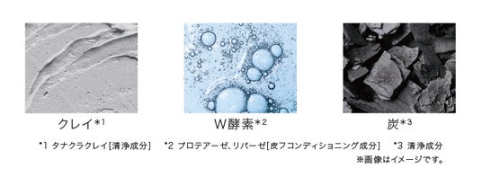 “クレイ*4×W酵素*5×炭*6”いった、毛穴洗浄をサポートする3つの成分を配合。汚れをW酵素*5で浮かせ、クレイ*4と炭*6で吸着してかきとることで、毛穴に入ったメイクや汚れ、古い角質までしっかりと落とします。