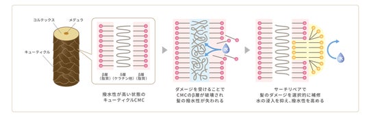 キューティクルCMCに生じたダメージホールを選択的に補修して埋めるサーチリペア。キューティクルが本来持つ撥水性を保ち、ダメージの進行を防ぎます。