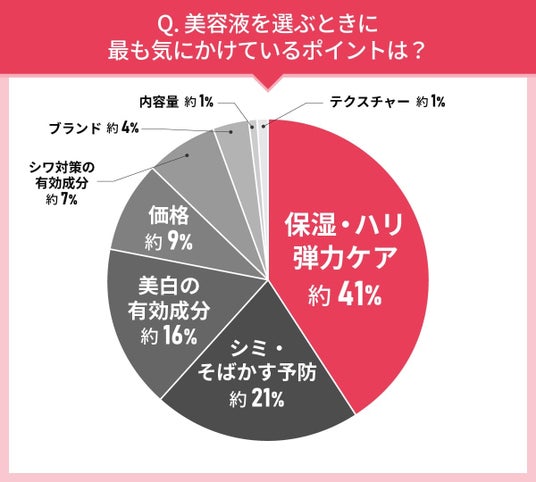 最も多かったのが「保湿・ハリ弾力ケア」の約41%でした。ついで、「シミ・そばかす予防」が約21%、「美白の有効成分」が約16%、「シワ対策の有効成分」も約7%と、美容液に期待される効果として、「肌悩みへの直接的なアプローチ」が重要視されているようですね。