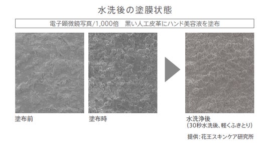 塗膜と肌表面の高い密着効果により塗膜が維持され、水で洗った後もヴェール感が残ります。