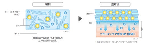 塗布するとゲルが均一に分散した塗膜を形成し、カプセルを崩さず維持。(+)の電荷を帯びた塗膜が肌の(−)の電荷と引き合うことで高密着し、コラーゲンケア成分SP(保湿:加水分解コラーゲン、ユキノシタエキス、加水分解シルク)が角層へ浸透。やわらかなハリ肌へ導きます。