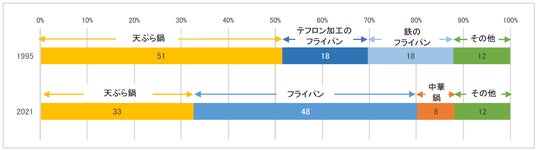 家庭での揚げ物に使う調理器具については、1995 年の「キッチンにおける『油』の存在調査」において、天ぷら鍋を使う人が半数でしたが、2021 年の同調査ではフライパンを使う人が半数となりました(グラフ3参照)。