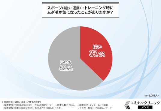 そこで今回、スポーツ(競技・運動)・トレーニングを行っている方の体毛事情に焦点をあてるべく、メンズ専用脱毛クリニック・エミナルクリニックメンズは、20代~30代男性を対象に、「運動と体毛」に関する調査を実施しました。