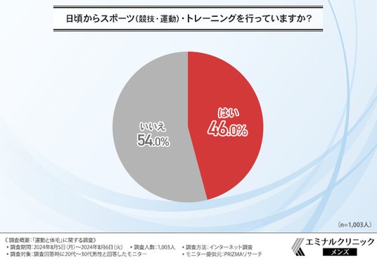 「日頃からスポーツ(競技・運動)・トレーニングを行っていますか?」と質問したところ、『はい(46.0%)』『いいえ(54.0%)』という回答結果になりました。
