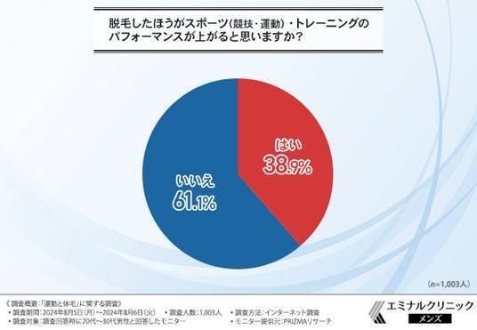 「脱毛したほうがスポーツ(競技・運動)・トレーニングのパフォーマンスが上がると思いますか?」と質問したところ、『はい(38.9%)』『いいえ(61.1%)』という回答結果になりました。