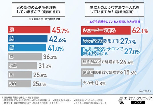 主に、足や腕など、半袖や半ズボンを着用の際に露出する部位のムダ毛を処理している方が多く、処理方法としてシェーバーやワックスを使用したり、クリニックやサロンでの施術を
