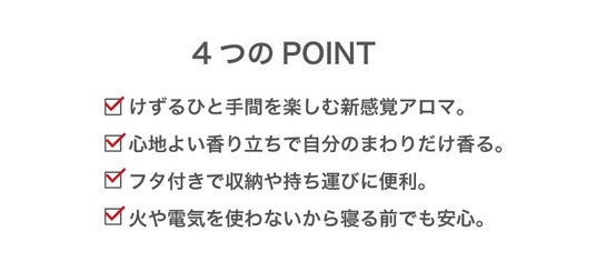 忙しい日々の中で、心を落ち着ける時間を作ってもらうために開発しました。「けずる」というひと手間をかけることで、パーソナルな空間で心地よく広がる香りや削り心地に癒され、心がほぐれていくのを感じます。上質な香料を贅沢に配合し、けずるだけで香りがやわらかく広がり、火も電気も使わないので、寝る前でも安心して使用できます。