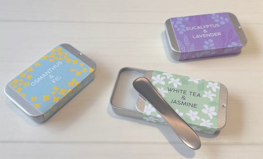 フタ付きの缶入りタイプなので、収納や持ち運びにも便利。「ユーカリ&ラベンダー」、「オスマンサス&フィグ」、「ホワイトティー&ジャスミン」の3つの香り。