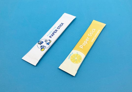 一般的なスティック包装(PET/PE/AL/PE)の表層のPETを紙基材に変更し、中間層のPEを削減した3層構成のスティック包装です。
