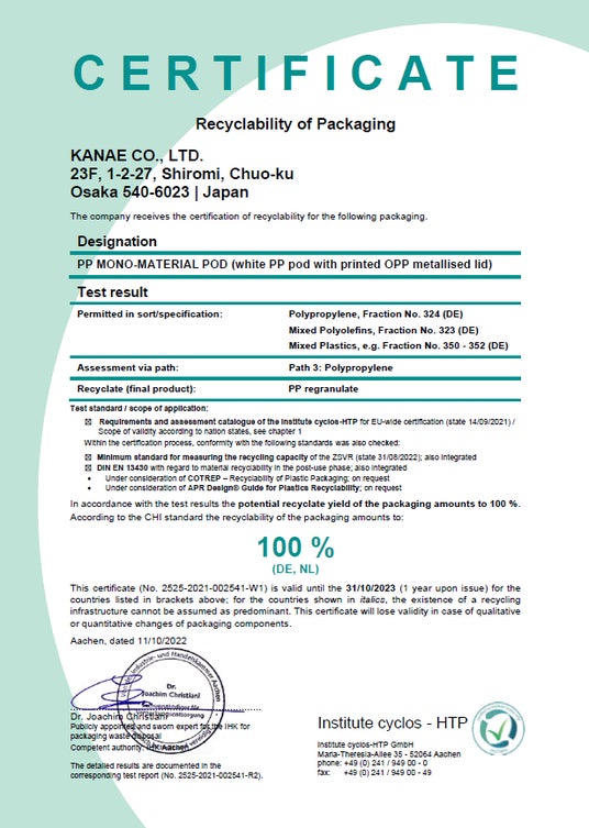 ドイツに拠点を置く独立研究所「Institute cyclos-HTP」より「PPとしてリサイクル適性100%」認証を取得しています。