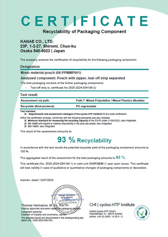 平パウチタイプについては、「Institute cyclos-HTP」より「PPとしてリサイクル適性93%」認証を取得しています。