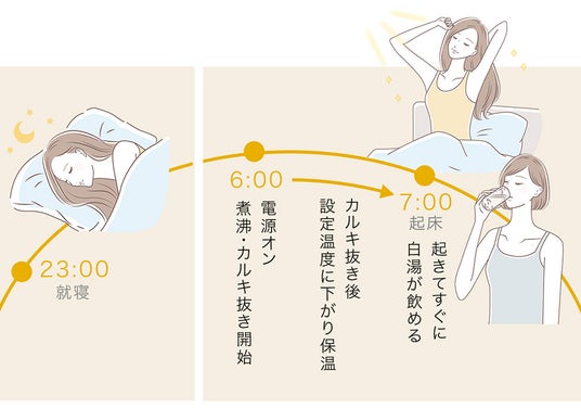 タイマー設定機能で、朝起きたらすぐにホンモノの白湯を
