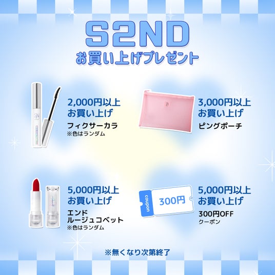 S2ND Qoo10メガ割ではお買い上げプレゼントもあり価格によって多様なプレゼントがもらえます。
