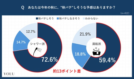 「今年の秋に、秋バテしそうな予感があるか?」との質問には、湯船派の59.4%に対して、シャワー派は72.6%が秋バテしそうと回答。