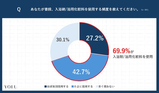 入浴剤/浴用化粧料の使用について聞いてみると、69.9%が「使用する」と回答。湯船に浸かる際には、半数以上の人が活用していることがわかりました。