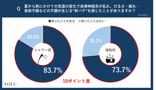 これからの季節に気になる、「気温の変化で自律神経系が乱れ、だるさ・疲れ・食欲不振などの不調が生じる秋バテの経験」について聞いてみると、シャワー派で83.7%、湯船派で73.7%が経験ありと回答。