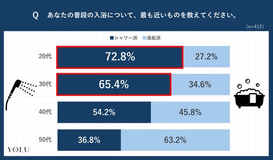 20~30代はシャワー派率が約7割と高いことが明らかに。40~50代と比べると11ポイント以上の差がありました。
