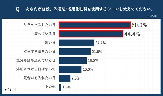 また、利用シーンで最も多かったのは「リラックスしたい日」(50.0%)、2位は「疲れている日」(44.4%)との回答で、入浴剤/浴用化粧料を用いて湯に浸かる入浴タイムが癒しのひとときになっている様子がうかがえます。