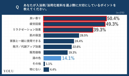 秋バテ対策にも有効といわれる入浴。入浴剤/浴用化粧料の選び方についても調査したところ、1位「良い香り」(50.4%)、2位「疲労回復効果」(49.3%)、3位「リラクゼーション効果」(39.3%)という結果になりました。