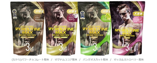 (左から)パワーチョコレート風味 /ストイックバニラ風味 /マッスルストロベリー風味 /ストロングバナナ風味パンプマスカット風味/アクセルレモネード風味/抹茶風味/マグナムココア風味 700gシリーズ