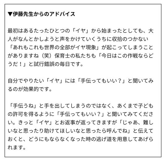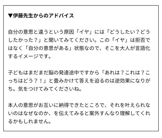 そのためやりたいことができなかったり、言いたいことがあるのにうまく言えなかったりすると、子どもはイライラします。そんな時に声をかけると子どもは「イヤ!」と言ってしまうのです。