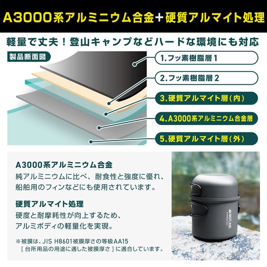 軽さと強度を追求した結果、材質に、純アルミニウムに比べ耐食性と強度に優れた「A3000系アルミニウム合金」を採用しました。さらに、リュックなどに入れガシガシ持ち運ぶハードな環境にも対応できるよう、硬度と耐摩耗性をアップさせるため「硬質アルマイト処理」を施しています。