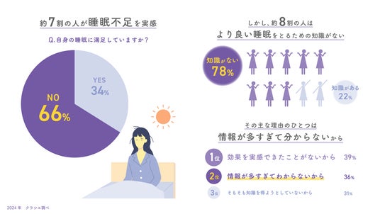 クラシエ株式会社(ホームプロダクツカンパニー)は、9月3日の「秋の睡眠の日」に向けて、35~54歳の女性400人を対象にした「睡眠に関する意識調査」を実施しました。寝具だけでなく、サプリや食品、アプリなど睡眠に関連する市場は年々伸長しており、「レム睡眠」や「ノンレム睡眠」、「快眠」、「熟眠」、「睡眠負債」などの睡眠の質に関するワードが話題になることも多いことから、睡眠に対する関心度は高まっていることが伺えます。しかし、本調査では7割以上の人が未だに睡眠不足を実感。さらに、約8割の人が「良い睡眠を取るための知識を持っていない」と回答し、「情報が多すぎて何をしたら良いか分からない」という理由も挙げられ、睡眠対策迷子となっている人が多くいることが判明しました(グラフ等を最終ページに掲載)。