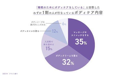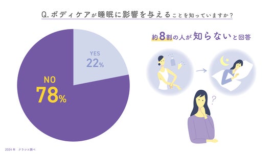 実際、今回の調査でも、3人に1人が「睡眠中の乾燥によるカサカサ悩みを実感している」と回答しました。一方で、約8割の人が「ボディケアが睡眠に影響を与えていること」を知らず、満足な睡眠をとるためにしていることに「ボディケア」を挙げる人は1割未満の少数派であるという実態も明らかになりました。