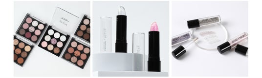 (左)ドット アイカラーパレット(全5種)300円(税込330円)/(中央)ジュエリー リップスティック(全2種)/(右)グリッタージェル(全4種)100円(税込110円)