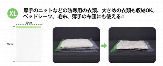 XLサイズ(50×70cm):ダウンジャケットやコート、毛布などの大物を収納。