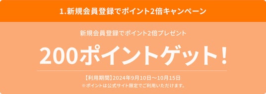 キャンペーン説明:この期間中に新規会員登録を完了されたお客様には、200ポイントを還元します(レギュラー会員が100ポイントに加え、さらに100ポイントが追加で付与されます)。