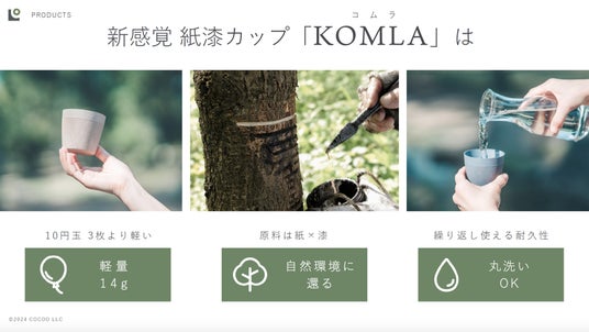 KOMLAは特殊加工の紙製カップに、木の樹液から採れる天然漆をコーティングしています。環境負荷も少ないのが特徴の一つ。