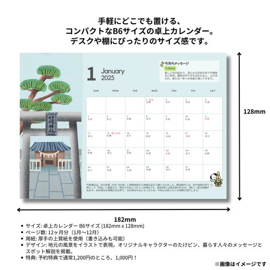 - 12ヶ月分の美しいイラストに加え、地元の人々のメッセージやスポットの魅力を解説する内容も楽しめます。