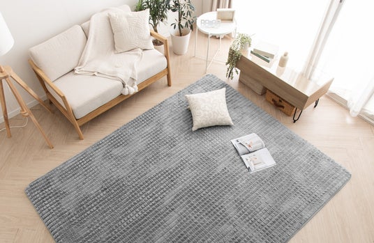 本製品はラビットファー調の毛足に立体感のあるデザインを施すことで、モコモコとした可愛らしい格子状のデザインになっております。インテリアに合わせやすいシンプルさを持ちながらも、個性的な見た目をしています。