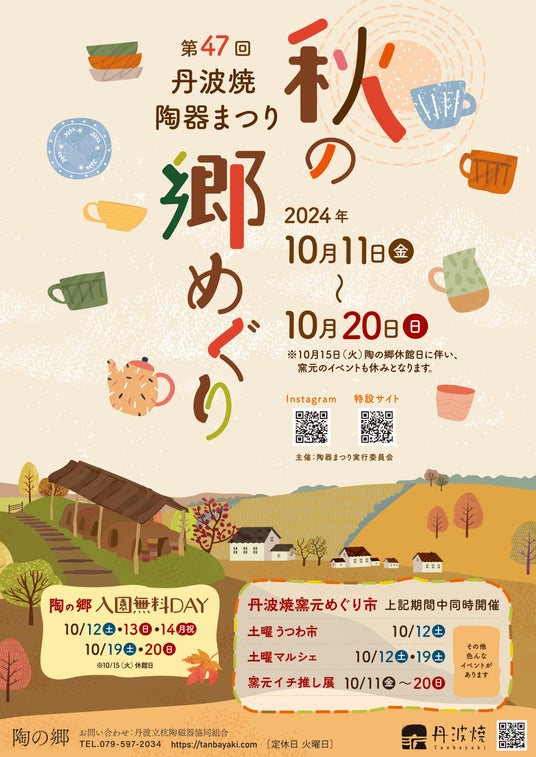 丹波篠山市丹波焼陶器まつり実行委員会(丹波篠山市・丹波立杭陶磁器協同組合ほか)は、2024年10月11日(金)から10月20日(日)まで、「第47回丹波焼陶器まつり 秋の郷めぐり」を開催します。
