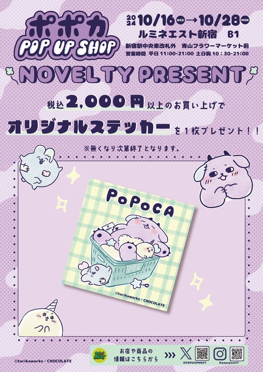 開催期間中、ポポカ関連商品を合計2,000円(税込)以上購入の方に、特典としてオリジナルステッカーを1枚プレゼントいたします。