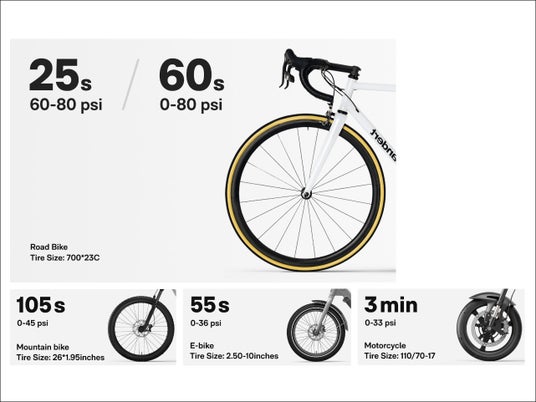 2,000mAhのリチウムイオンバッテリーを内蔵しています。最大8本の完全に空気が抜けた自転車のタイヤを膨らますことができ、空気圧が下がったタイヤなら18 本に空気を入れることができます。