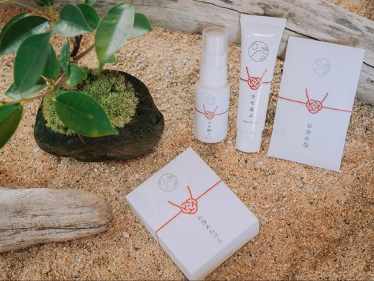 左:空間ミスト 中央:ハンドクリーム 右:お浄め塩 手前:石けん
