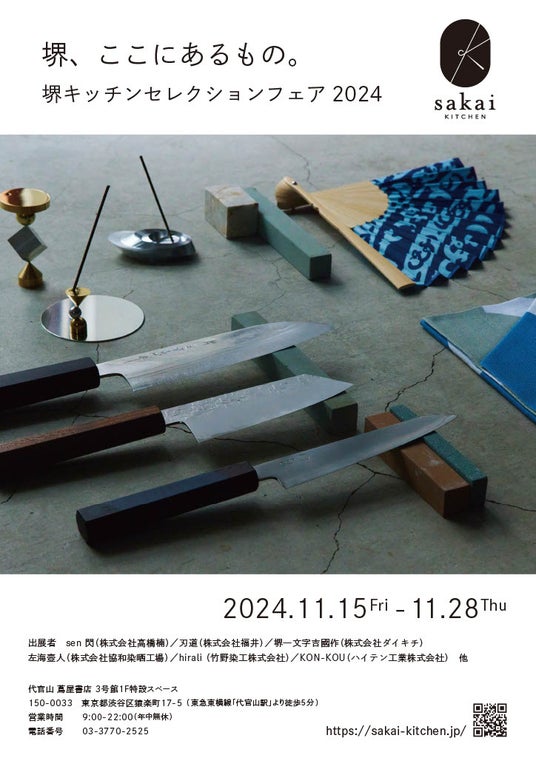 認定商品は、代官山蔦屋書店(東京都渋谷区)で期間限定販売(令和 6 年 11 月 15 日(金)~28 日(木)午前 9 時~午後 10 時)し、あわせて、による 大正6年創業の老舗、株式会社高橋楠による包丁研ぎ直しサービスを行います。※事前予約制