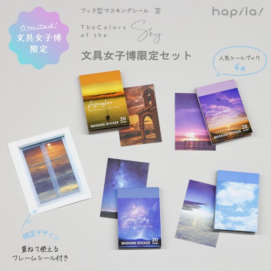 人気の「ブック型マスキングシール空-The Colors of the Sky-」4冊と、文具女子博2024限定の重ねて使える窓モチーフのフレームシールがセットになっています。